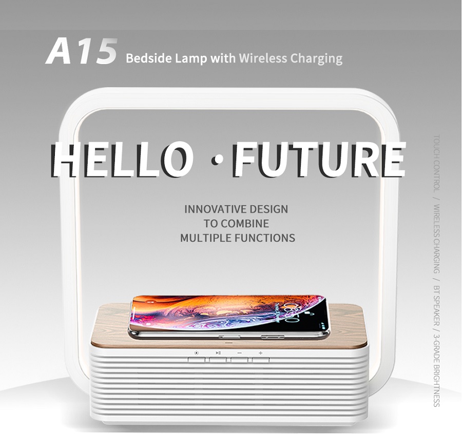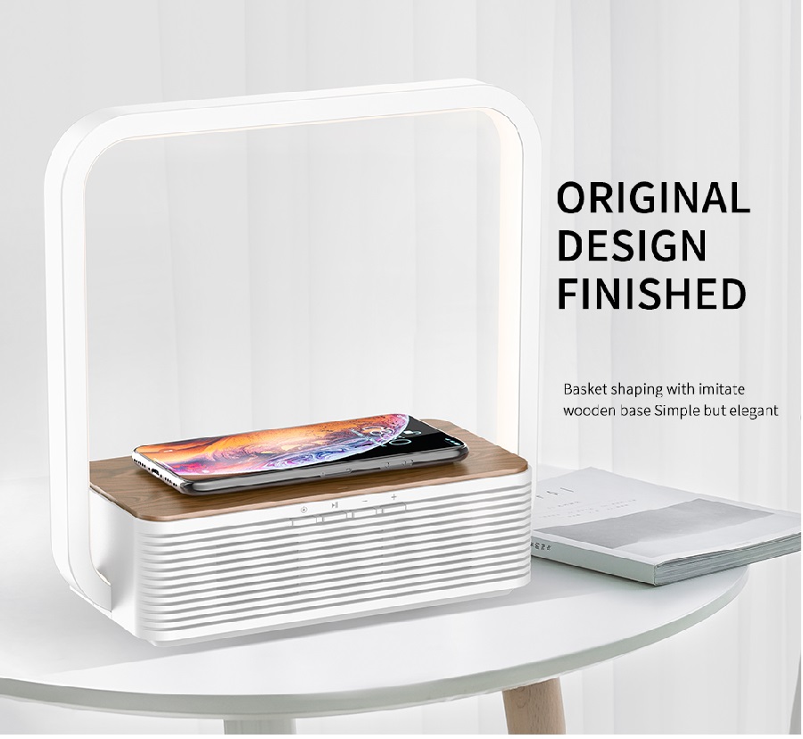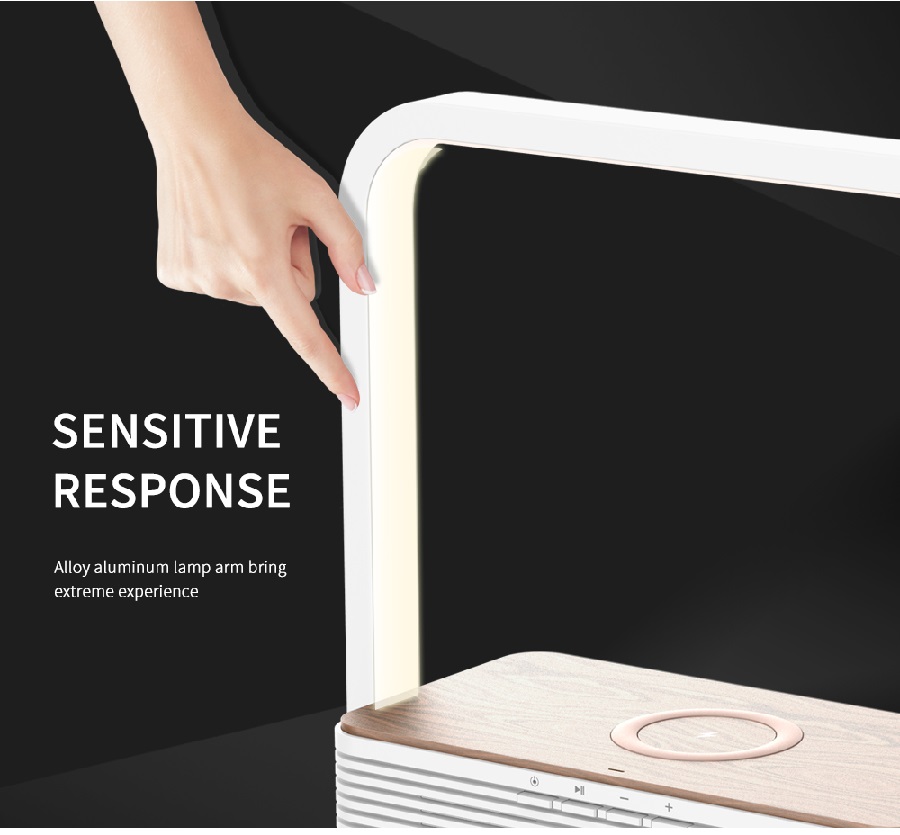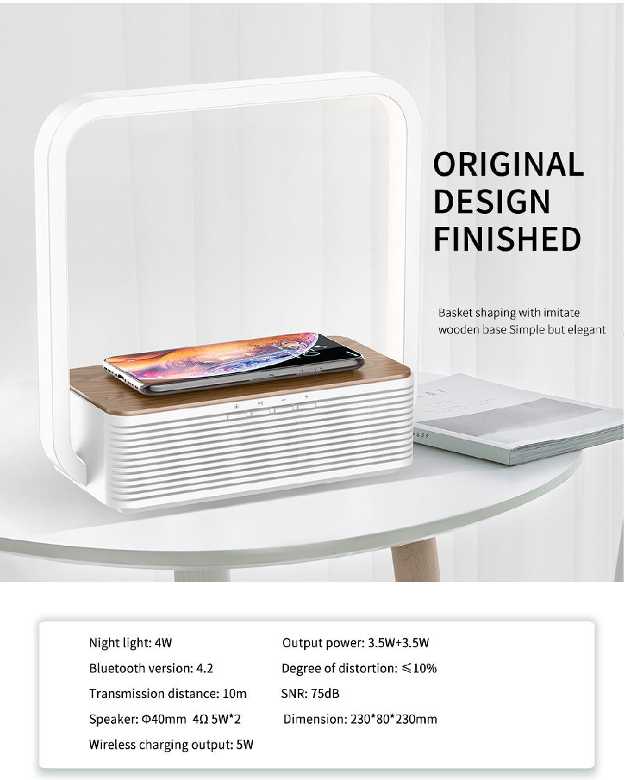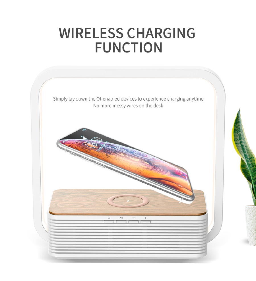 ★Wireless charging function: charging power output 5W ★Bluetooth speaker: enjoy high quality music ★3-grade brightness: touch dimmer ★ Wooden imitation charging base